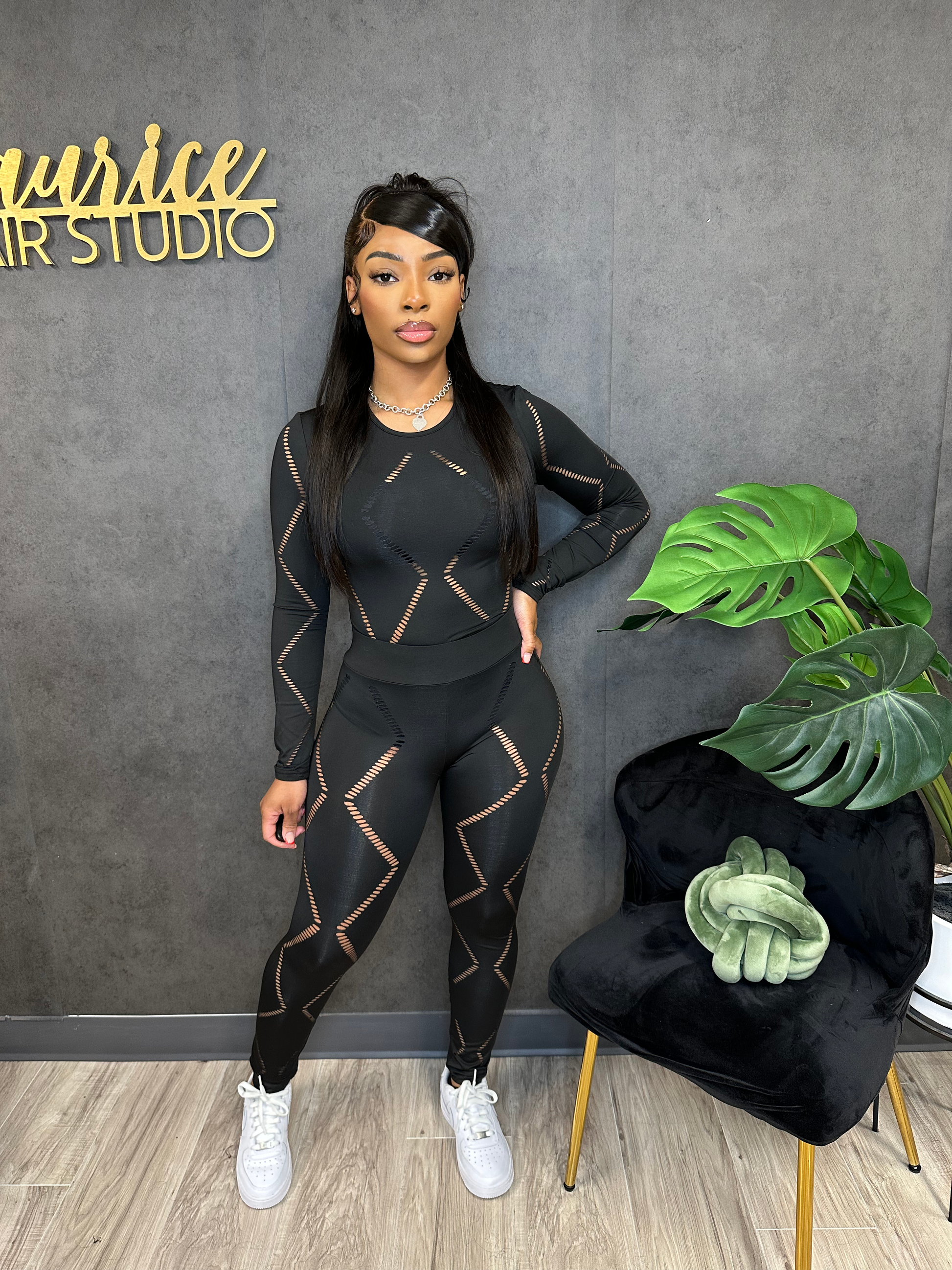 Long Sleeve Mesh Cutout Legging Black Set